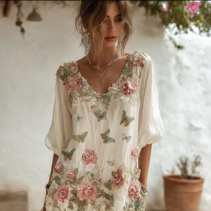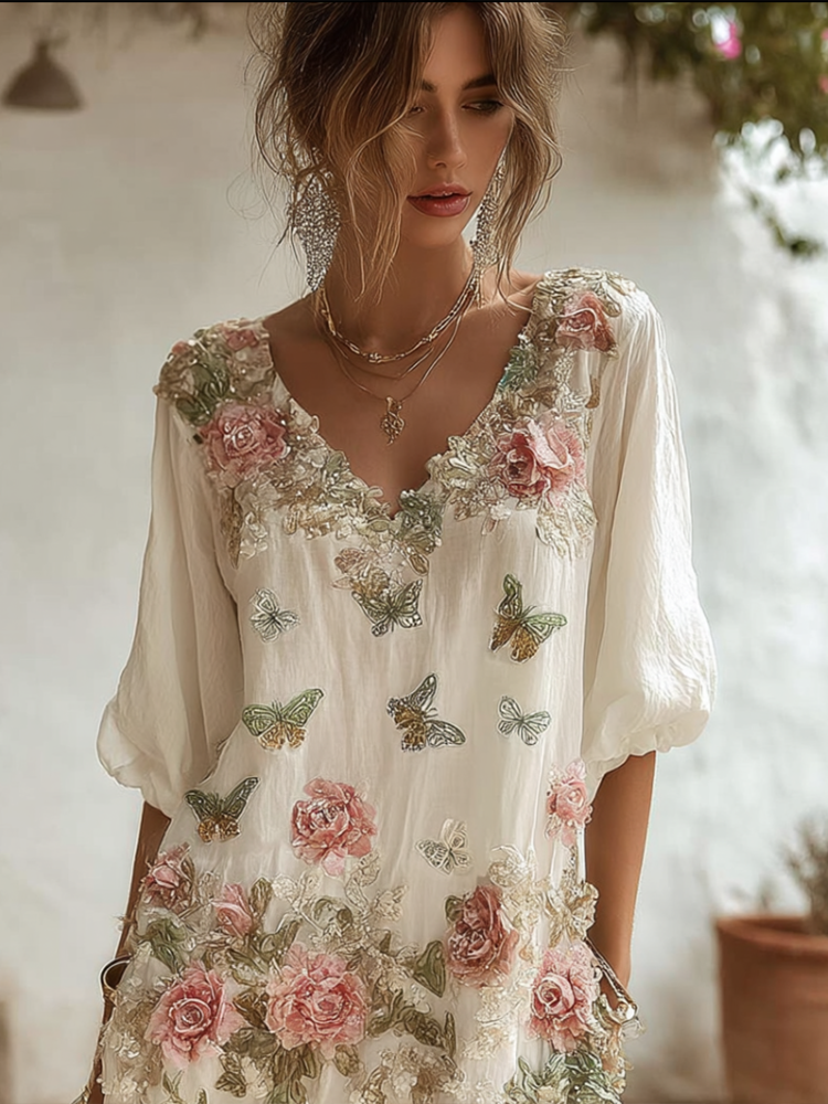 Bohemian Style Plant Flower And Butterfly Pattern Embroidery Design V-neck Woman's Long Dress