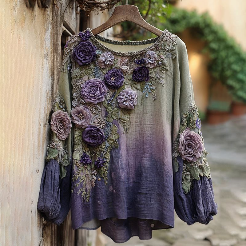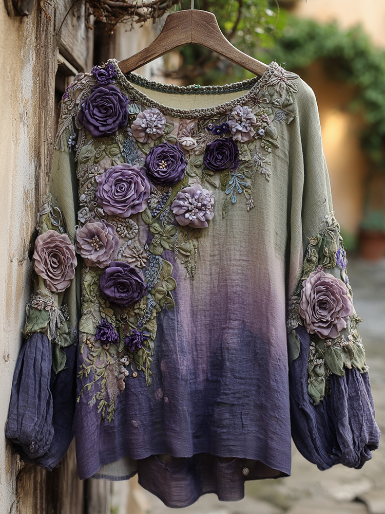 Classy Gradient Purple Lavender And Floral Embroidered Linen Long Sleeve Shirt