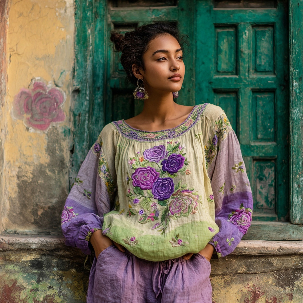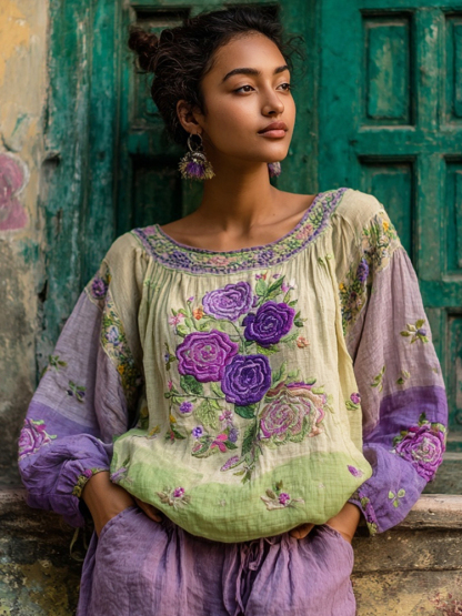 Ethnic Boho Floral Embroidery Women's Linen Loose Shirt