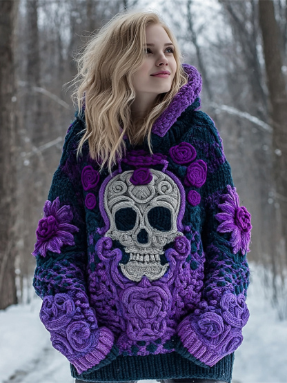 Gothic Skull Pattern Women's Chunky Knit Hooded Sweater