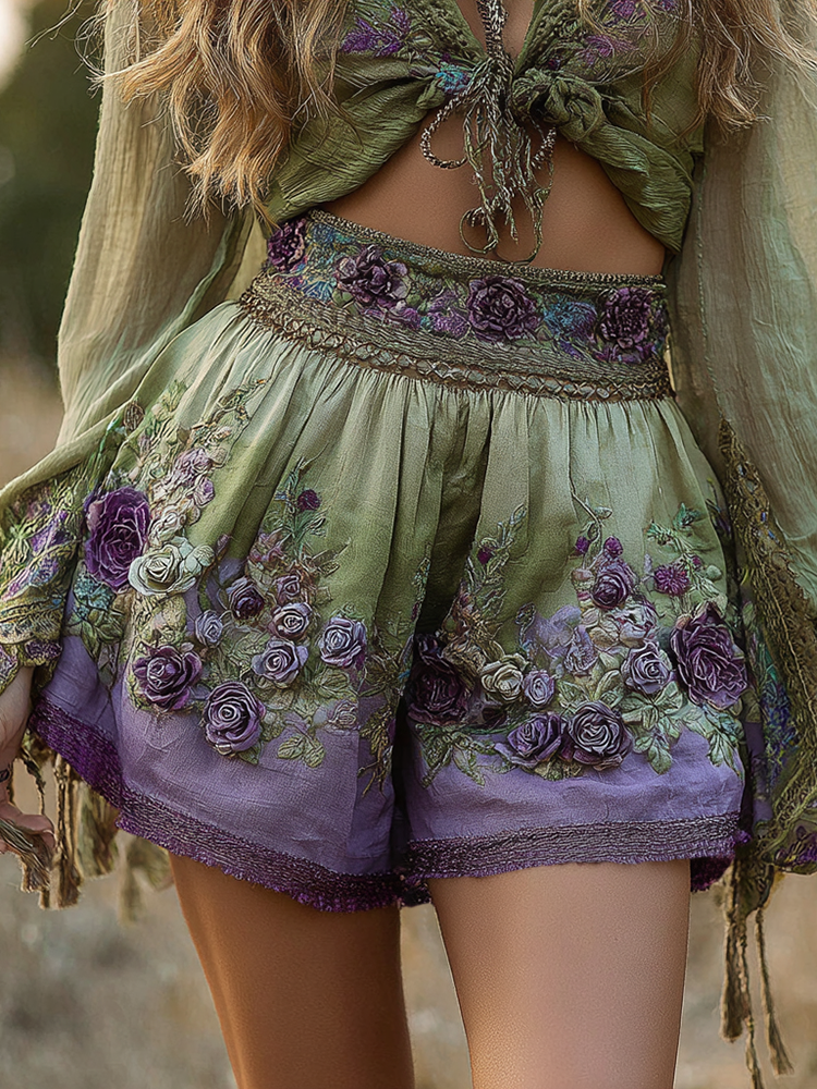 Gradient Purple Floral Embroidery Linen Blend Shorts