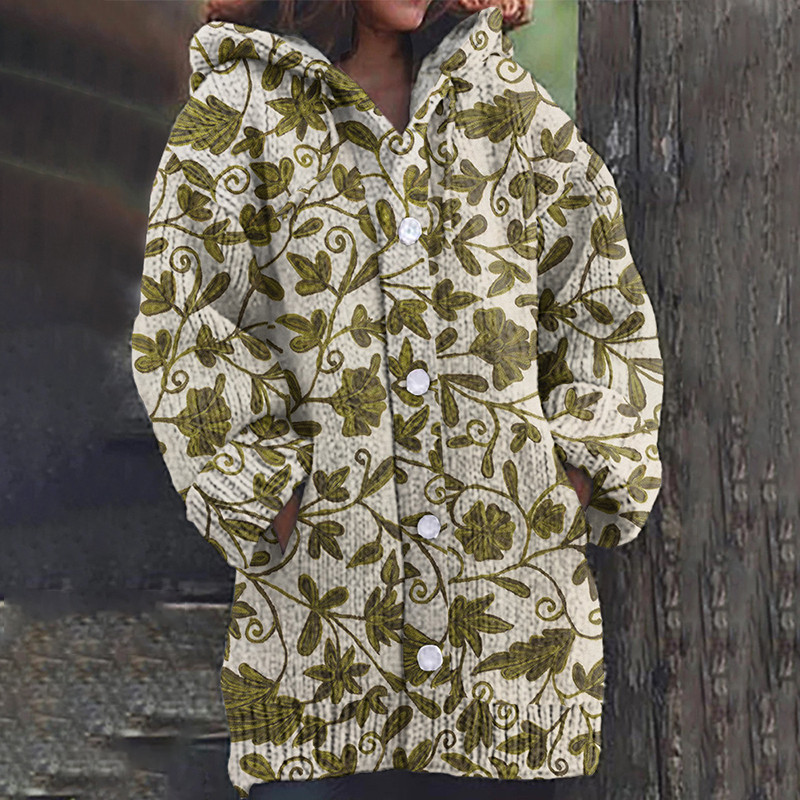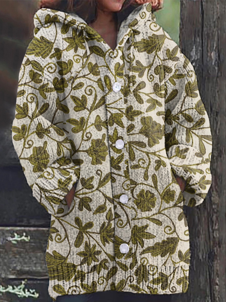 Green Plant Print Women'S Knitted Hooded Cardigan Sweater