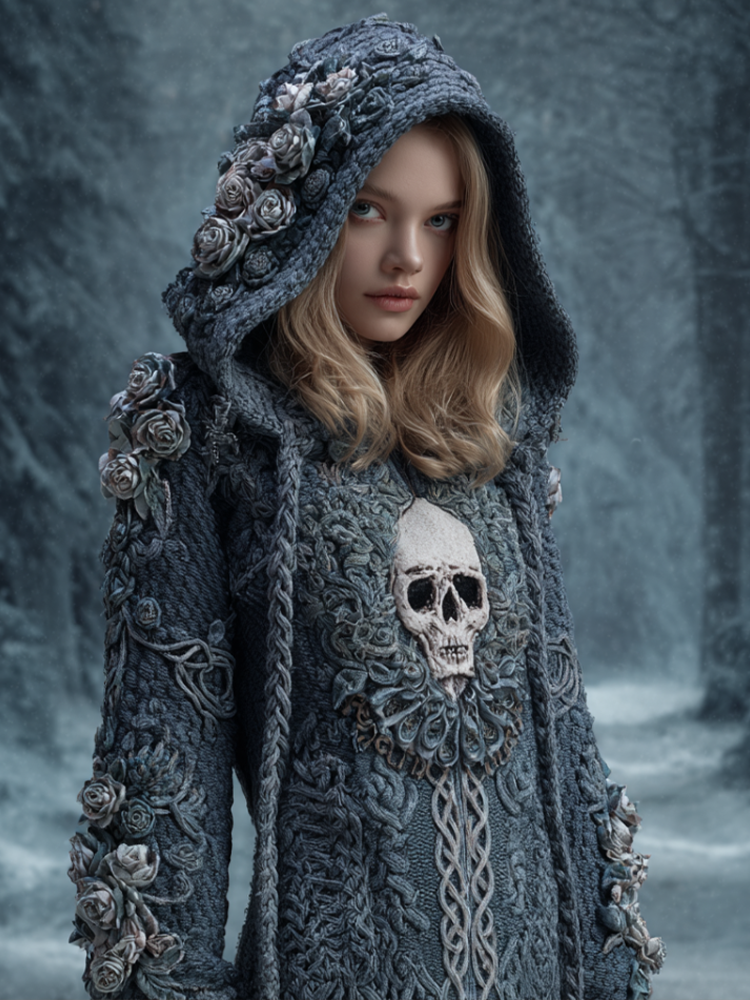 Halloween Skeleton Element Viking Style Women's Hooded Pullover Knit Sweater