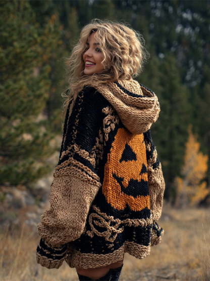 Halloween Spooky Pumpkin Lights Women's Chunky Knit Hooded Cardigan