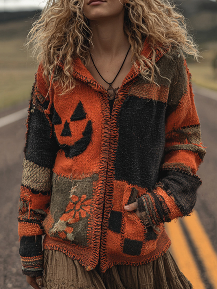 Patchwork Halloween Pumpkin Face Art Cozy Knit Hooded Cardigan