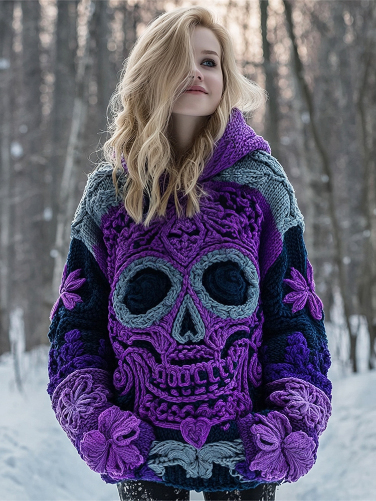 Quirky Skull & Flower Women's Chunky Knit Hooded Sweater
