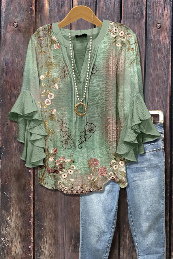 Retro Floral Print Ruffle Sleeve Top