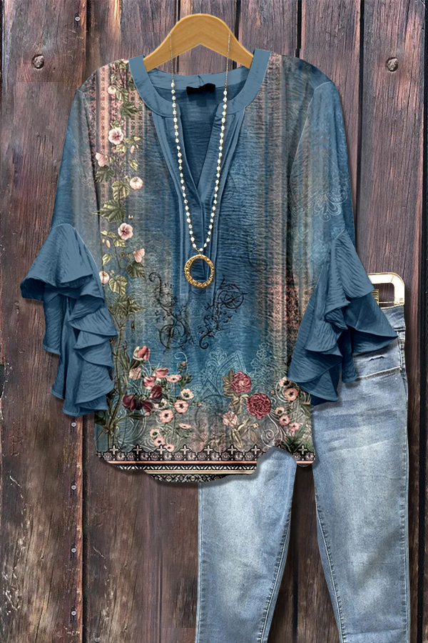 Retro Floral Print Ruffle Sleeve Top