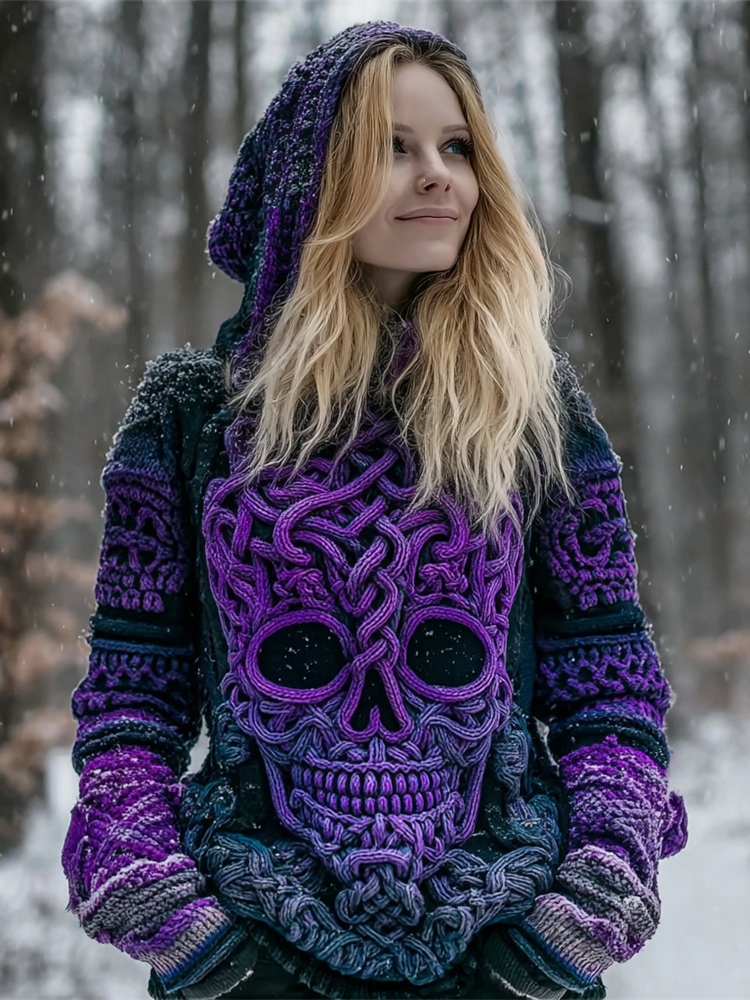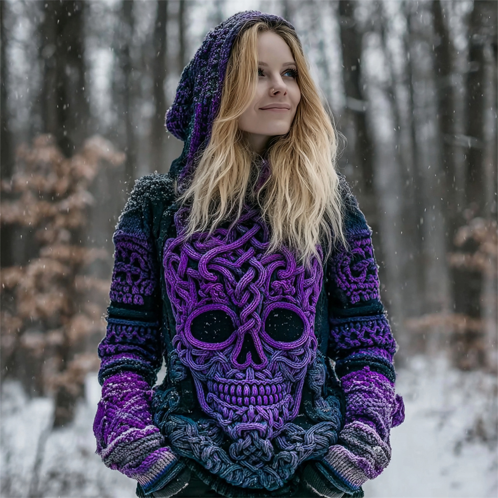 Viking Skull Pattern Women's Chunky Knit Hooded Sweater