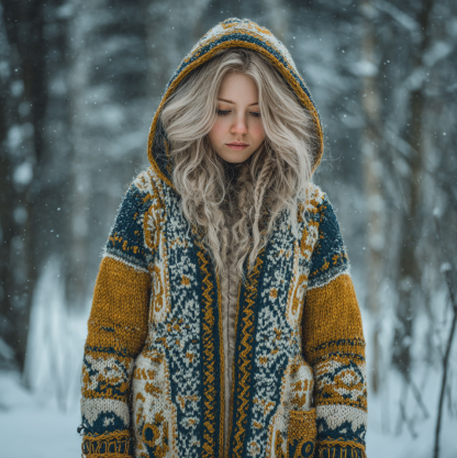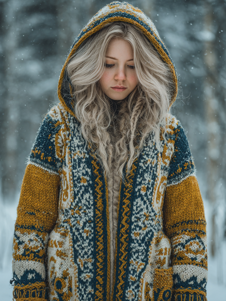 Viking Style Tribal Pattern Element Women's Hooded Pullover Knitted Thick Sweater Long Coat