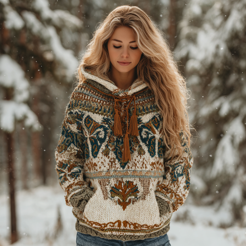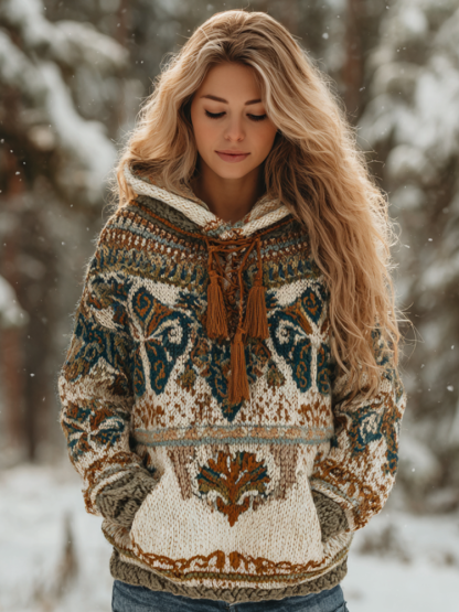 Viking Style Tribal Pattern Element Women's Hooded Pullover Knitted Thick Sweater