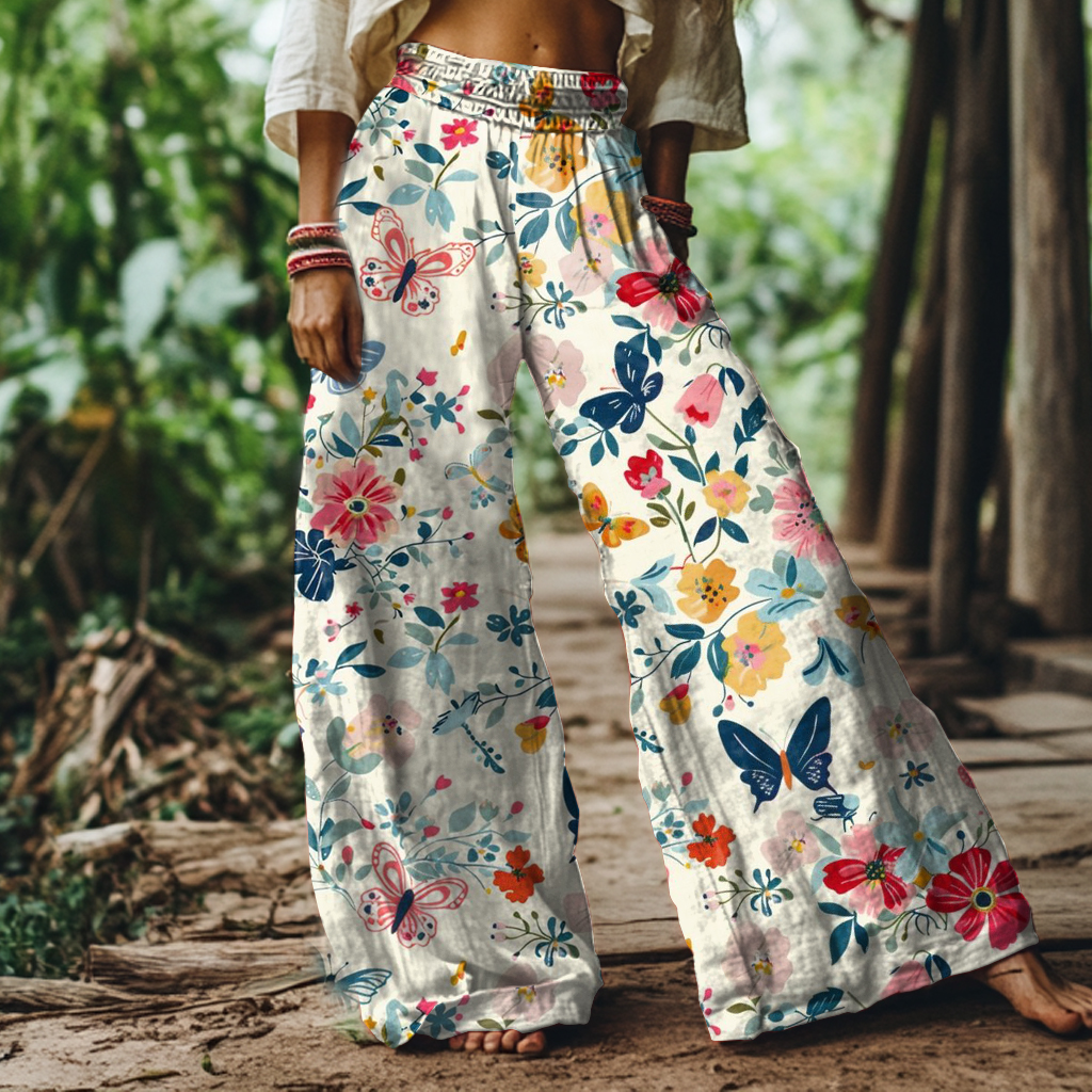 Vintage Butterfly Floral Art Print Loose Pants