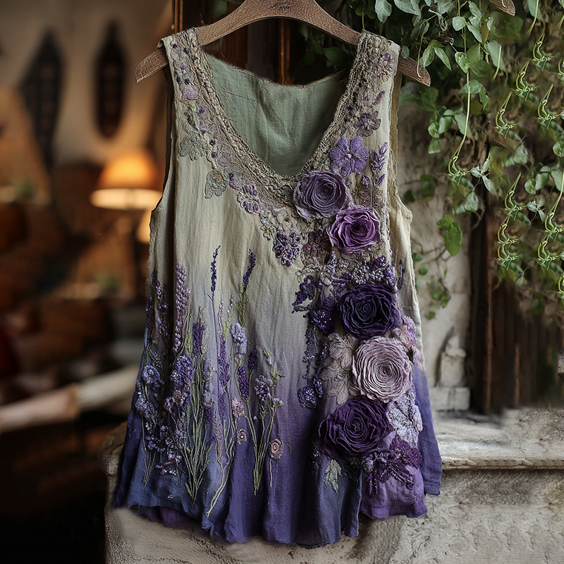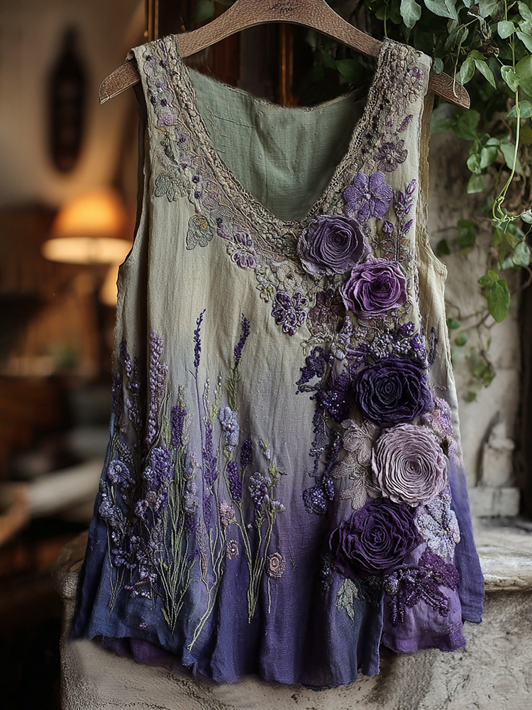 Vintage Classy Gradient Blue Rose And Floral Embroidered Pattern Linen V Neck Tank Top