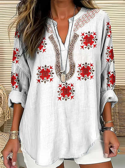 Vintage Cretan Pattern V-neck Linen Blend Blouse