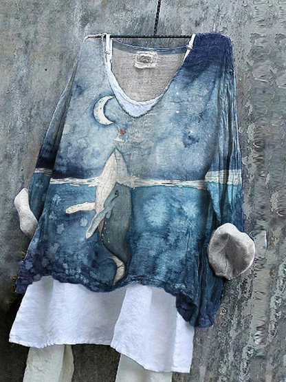 Vintage Humpback Whale Dreamy Art Pattern Linen Blend Tunic