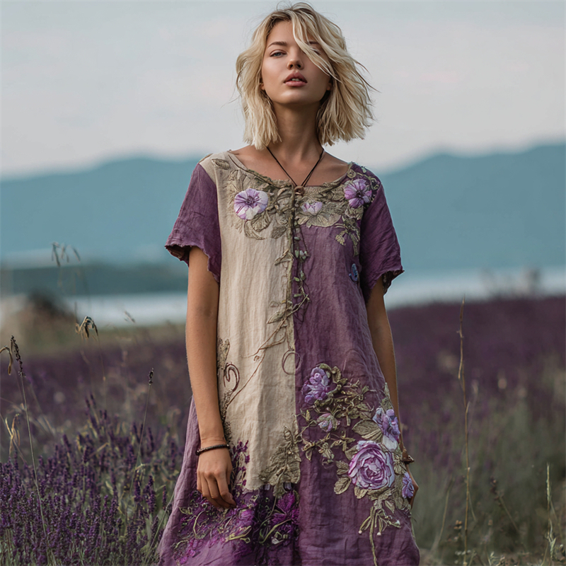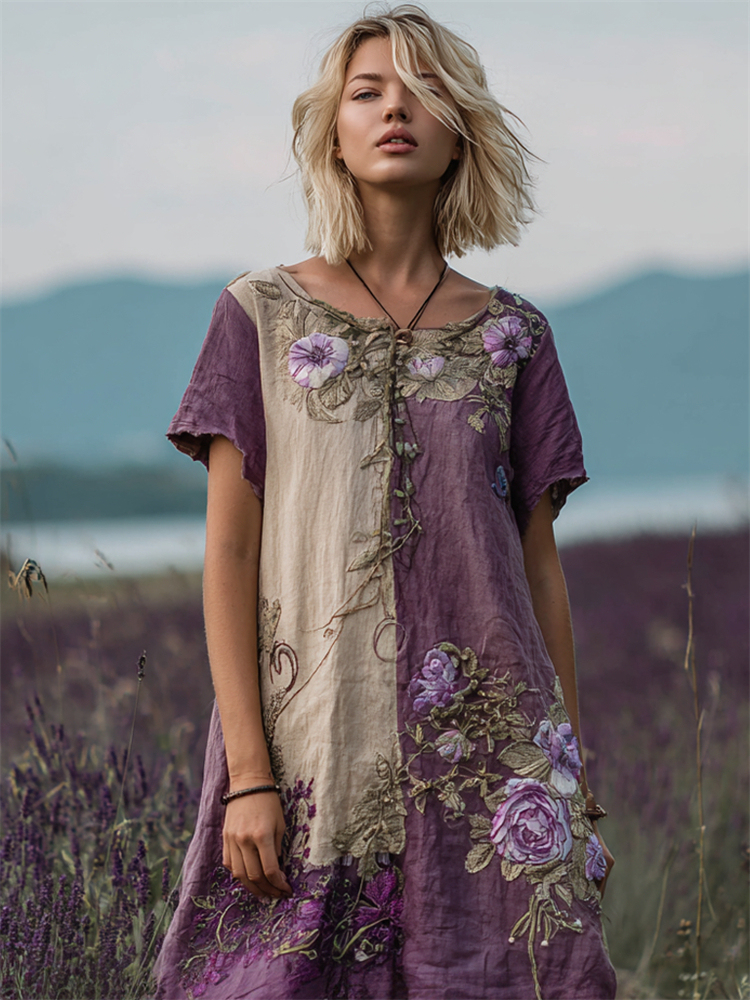 Vintage Lavender Roses Embroidered Patchwork Linen Dress