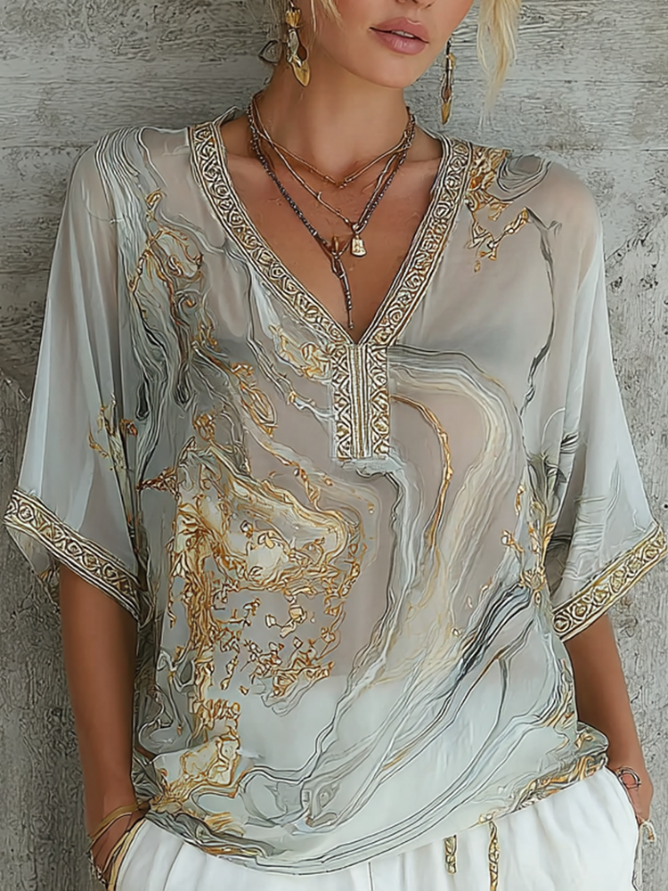 Vintage Marble Texture Collection Bohemia Women Style Gradient Gilded Pattern Linen V Neck T-shirt