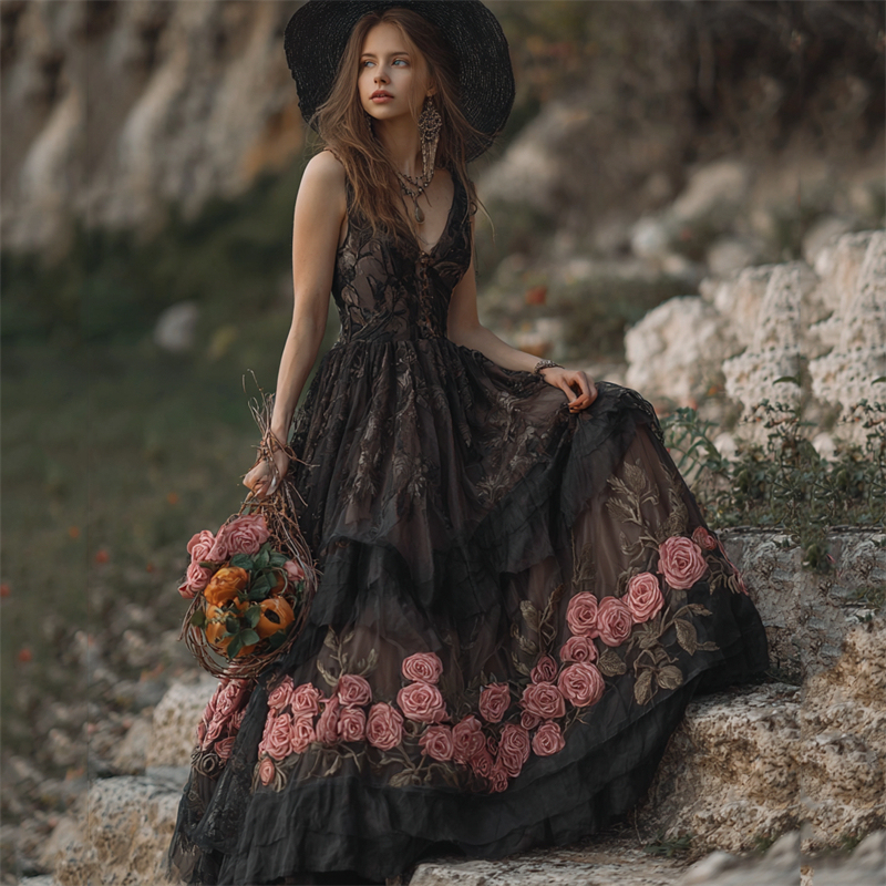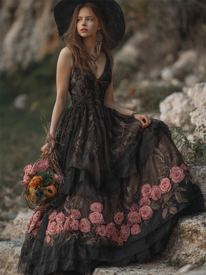 Vintage Pink Roses Black Lace Flowy Maxi Dress