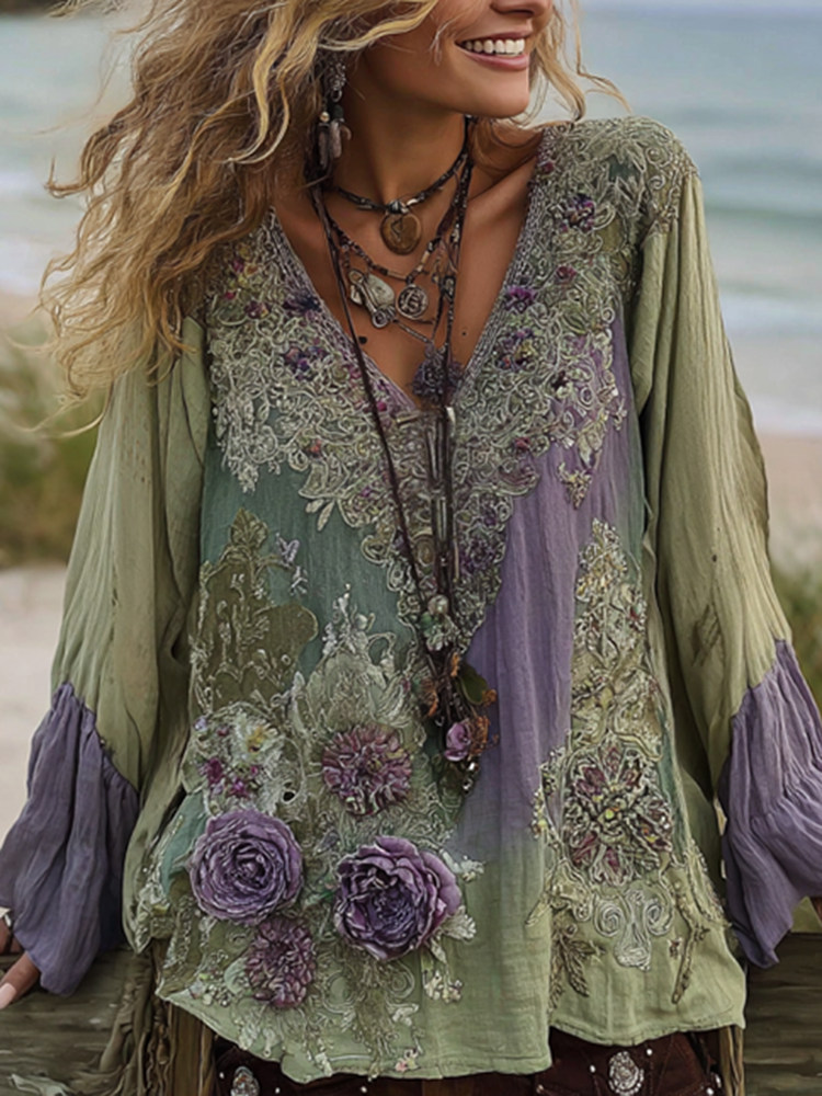 Vintage Purple Lavender And Floral Embroidered Linen V Neck Long Sleeve Shirt