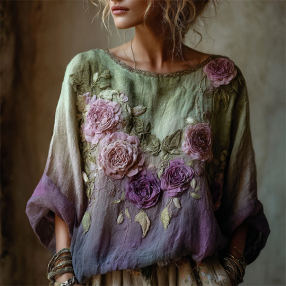 Vintage Roses Fiber Art Gradient Flowy Linen Tunic