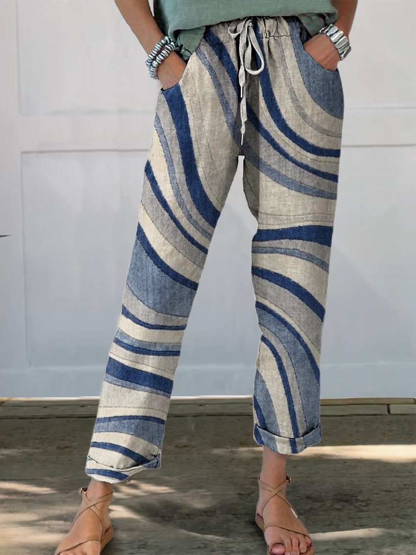 Wavy Stripe Print Women's Printed Cotton And Linen Casual Pants
