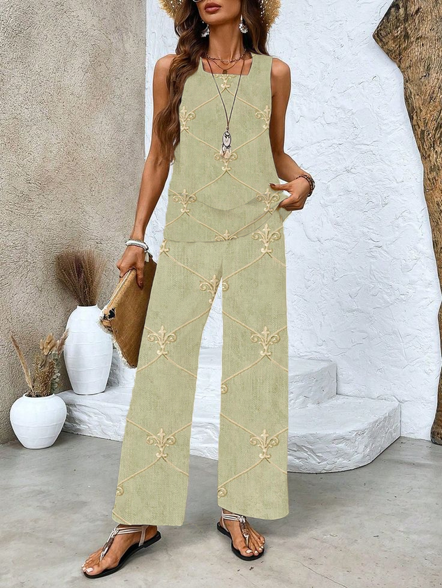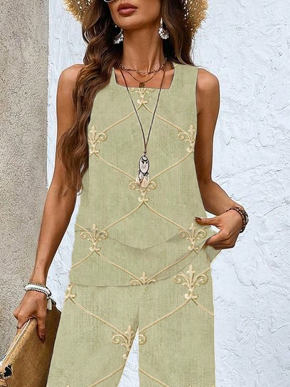 Women Floral Printing Two-Piece Set Daily Sleeveless Casual Summer Top With Pants Matching Set