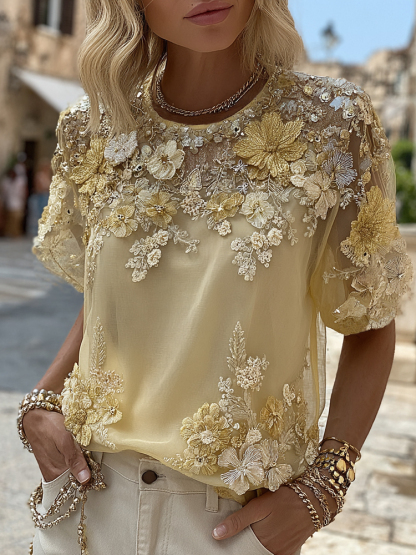 Women's Bohemian Yellow Roses And Floral Embroidery Art Linen Blend T-shirt