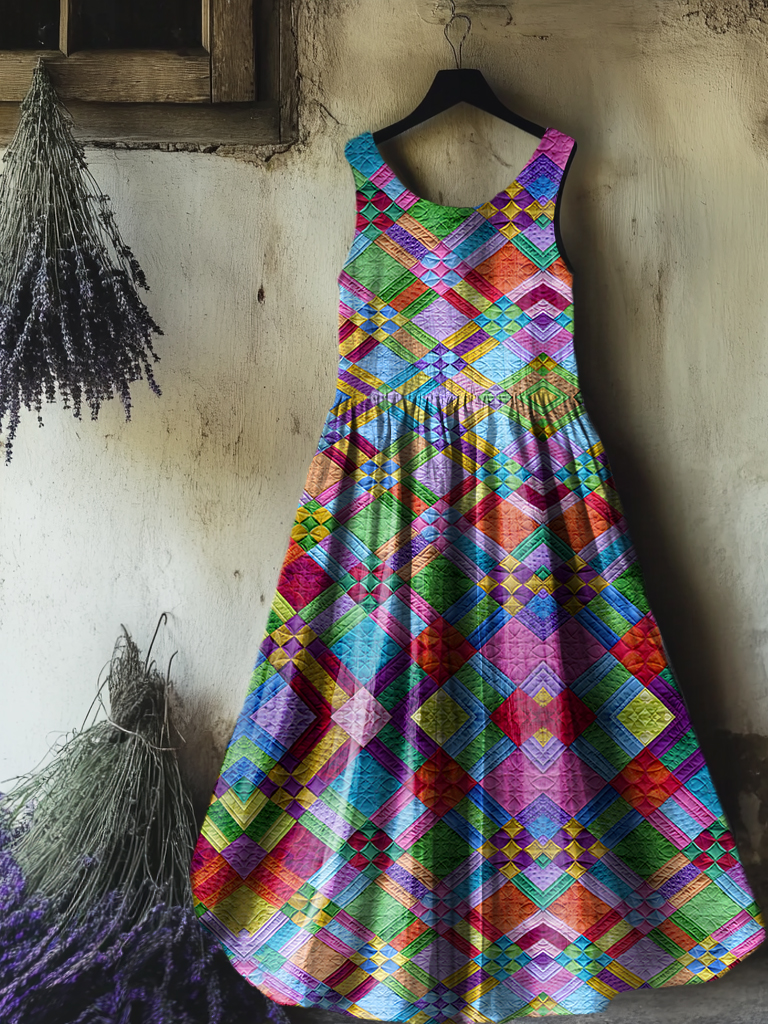 Women's Colorful Diamond Pattern Art Print Round Neck Sleeveless Cotton Pocket Dress