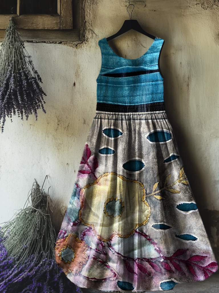 Women's Floral Art Print Round Neck Sleeveless Cotton Pocket Dresses
