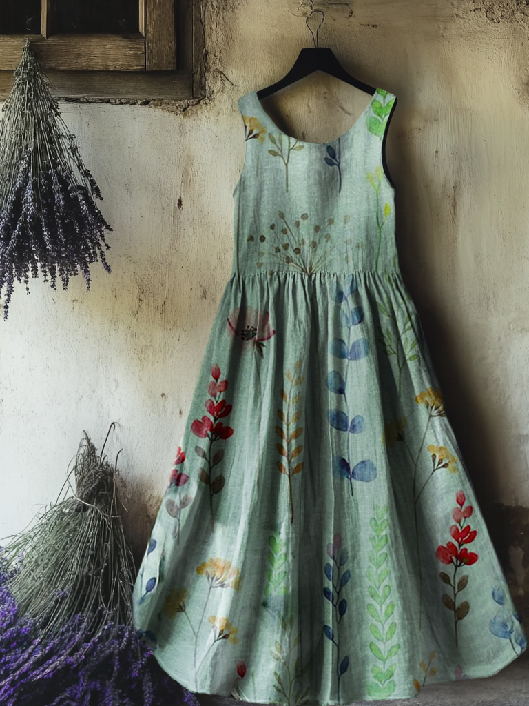 Women's Floral Art Print Round Neck Sleeveless Cotton Pocket Dresses
