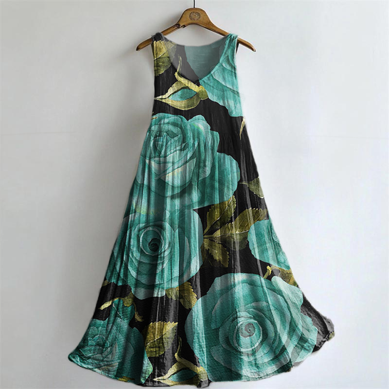 Women's Floral Art Print Round Neck Sleeveless Cotton Pocket Dresses