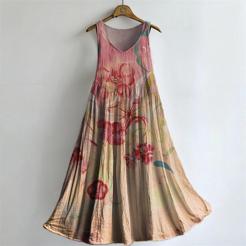 Women's Floral Art Print Round Neck Sleeveless Cotton Pocket Dresses