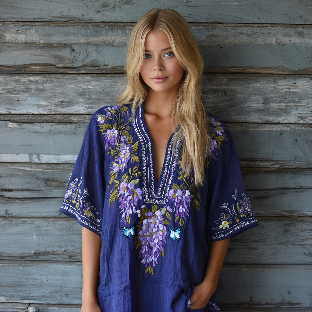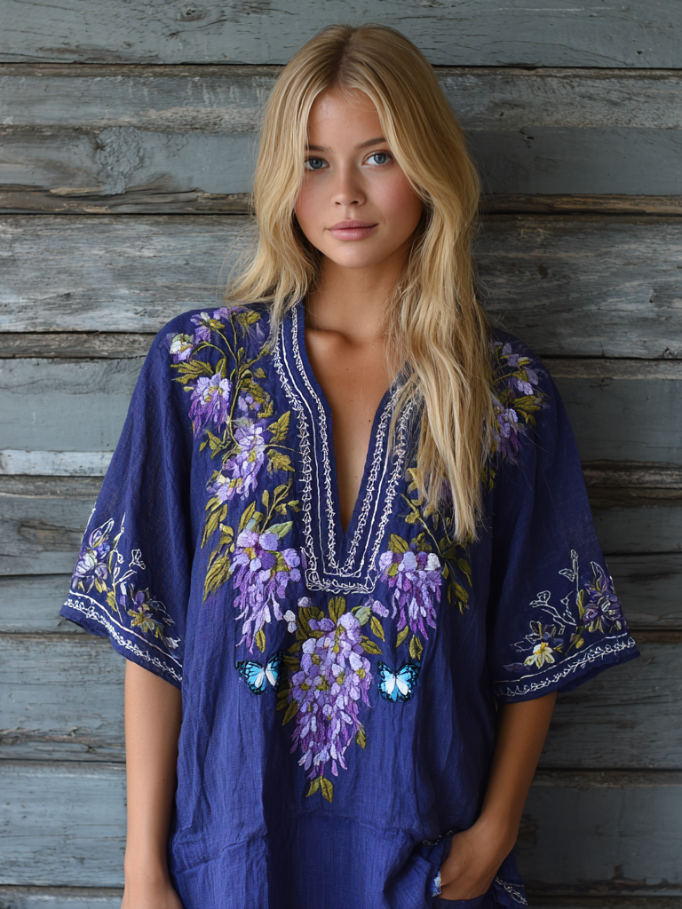 Women's Lavender Butterfly Embroidery Linen V-neck Shirt