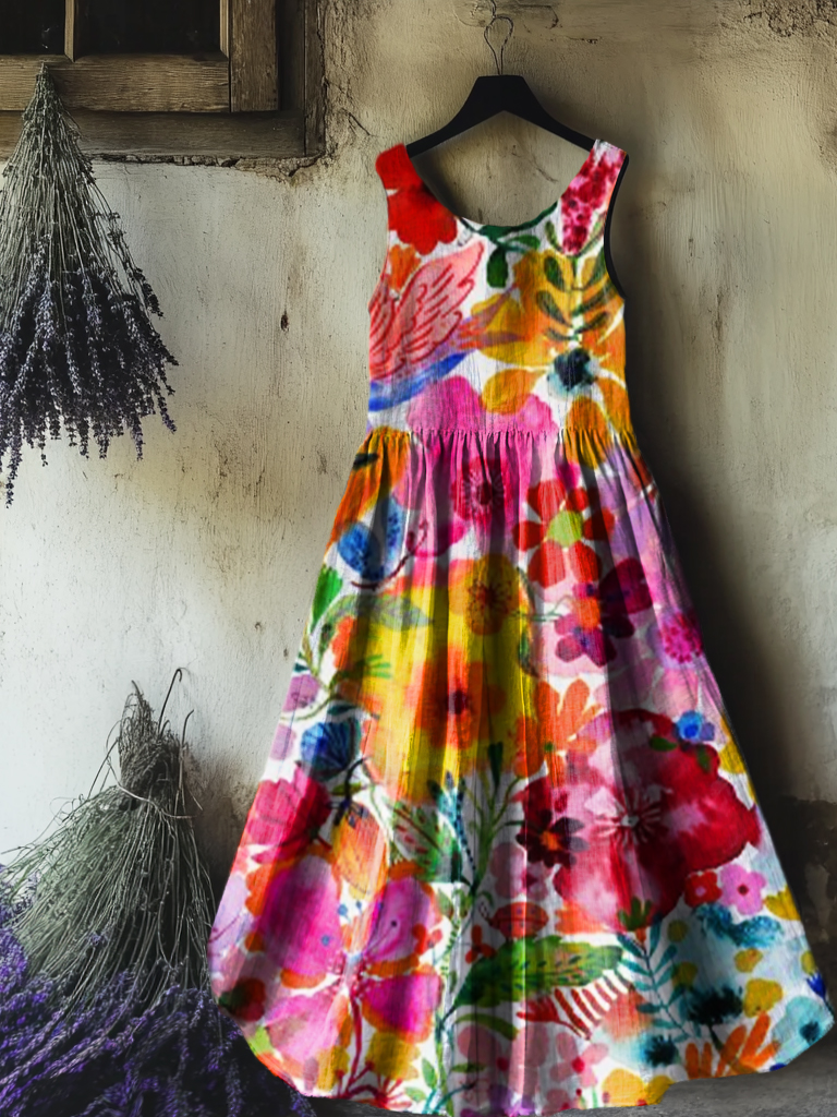 Women's Painting Floral Art Print Crew Neck Sleeveless Cotton Pocket Dress