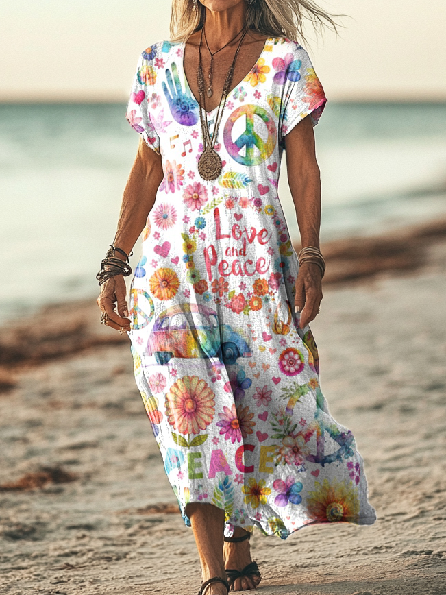 Women's Peace & Love Hippie Print Pocket Cotton Dress