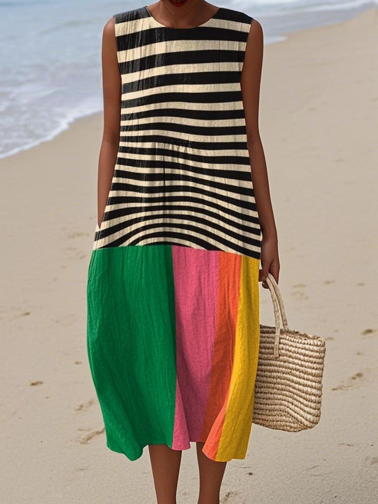 Women's Retro Abstract Geometric Print Cotton and Linen Dress
