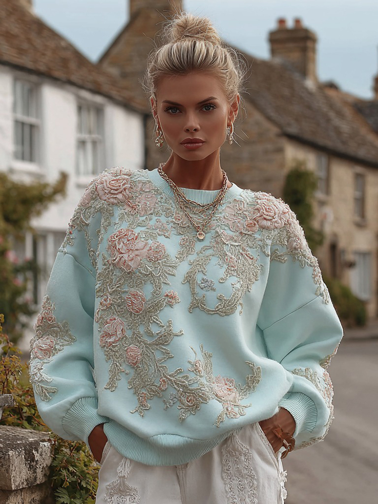 Women's Retro Bohemian Floral Embroidery Casual Crew Neck Sweatshirt