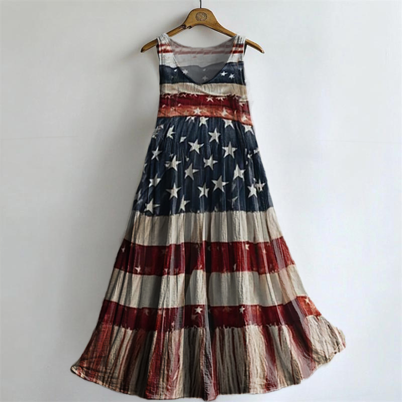 Women's Star Flag Color Matching Pattern Art Print Round Neck Sleeveless Cotton Pocket Dress