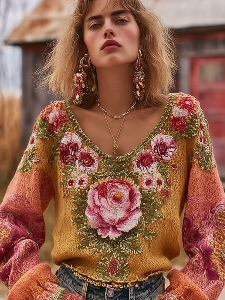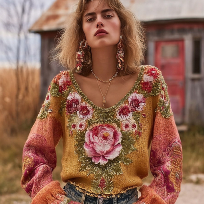 Women's Vintage And Timeless Floral V-neck Long-sleeved Sweater