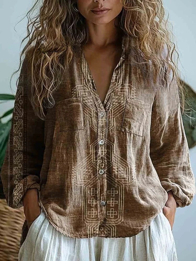 Women's Vintage Art Print Casual Long Sleeve Comfortable Cotton Shirt