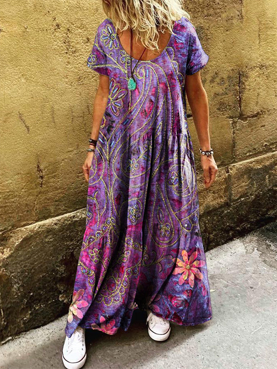 Women's Vintage Ethnic Paisley Art Print Pocket Short Sleeve Cotton Dress
