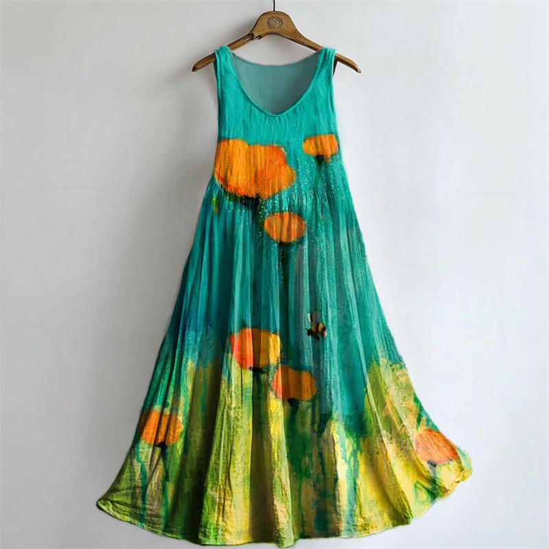 Women's Vintage Floral Art Print Crew Neck Sleeveless Cotton Pocket Dress