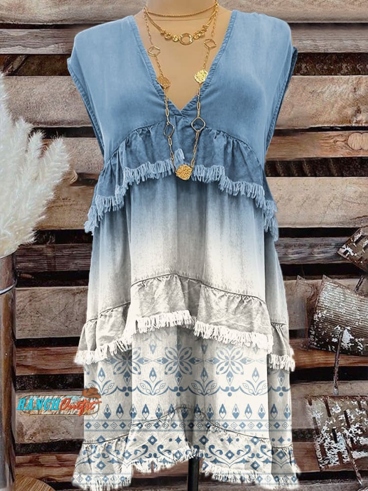 Women's Vintage Floral Art Print Denim Pocket Cotton Dress