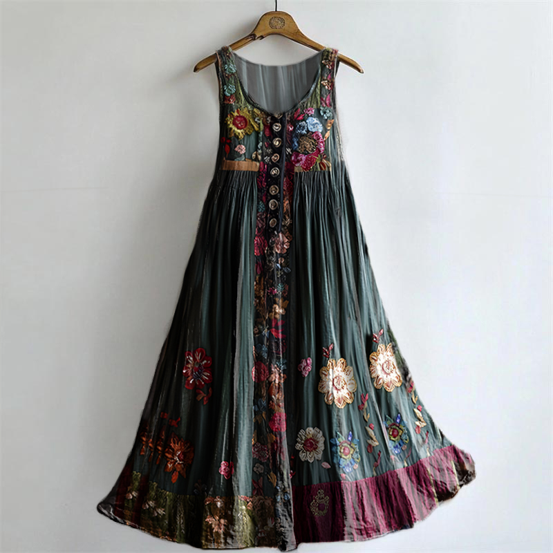 Women's Vintage Floral Pattern Art Print Round Neck Sleeveless Cotton Pocket Dresses