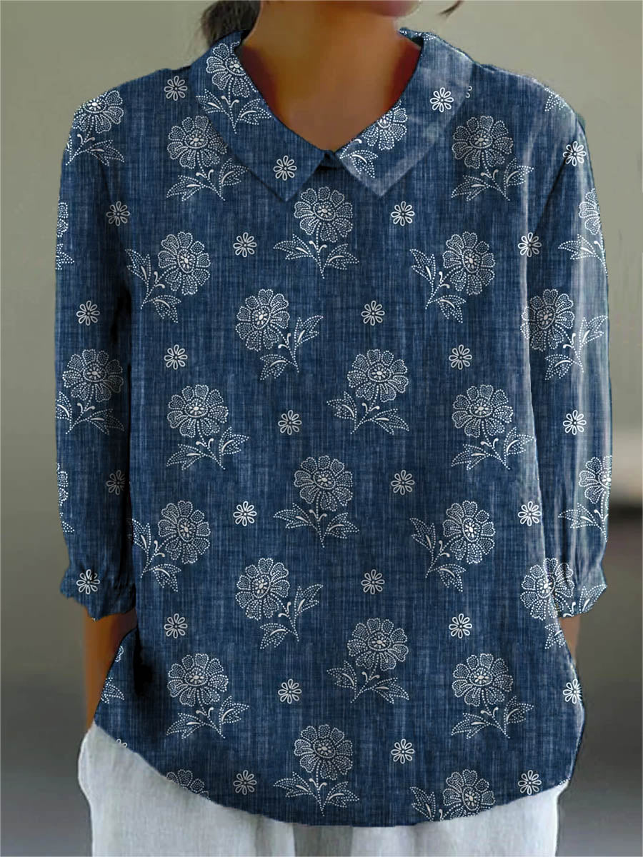 Women's Vintage Lovely Floral Art Print Casual Cotton And Linen 3/4 Sleeve Shirt