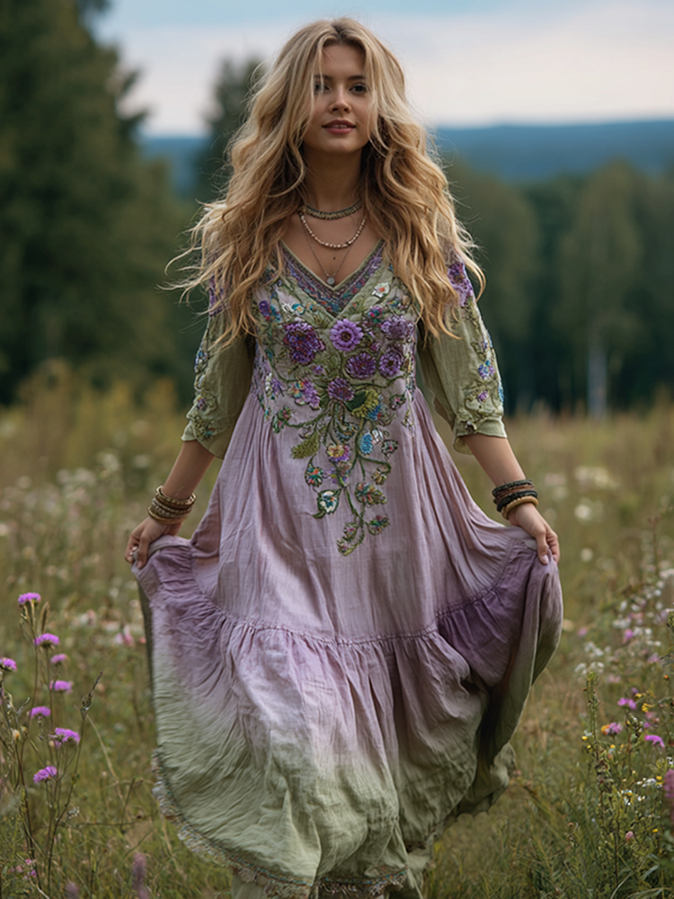 Women's Vintage Purple Floral Linen Long Sleeve Dress