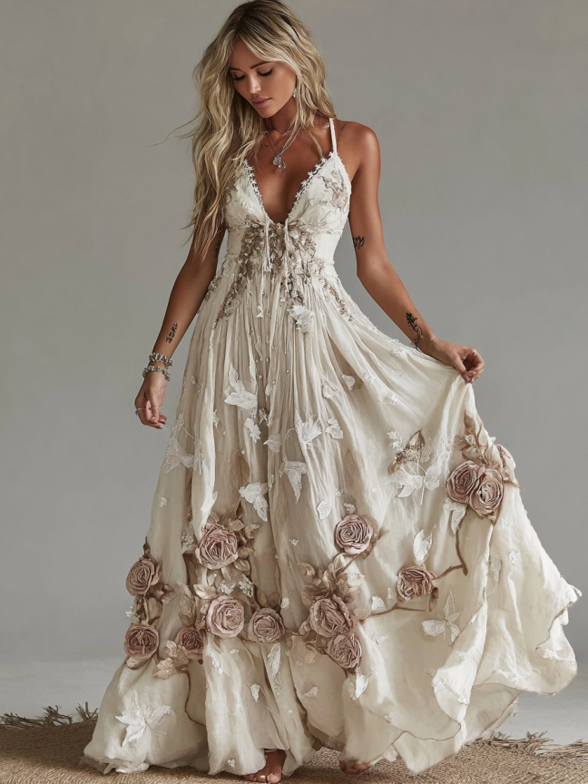 Women's Vintage Rose Embroidery Art V-neck Suspender Maxi Dress