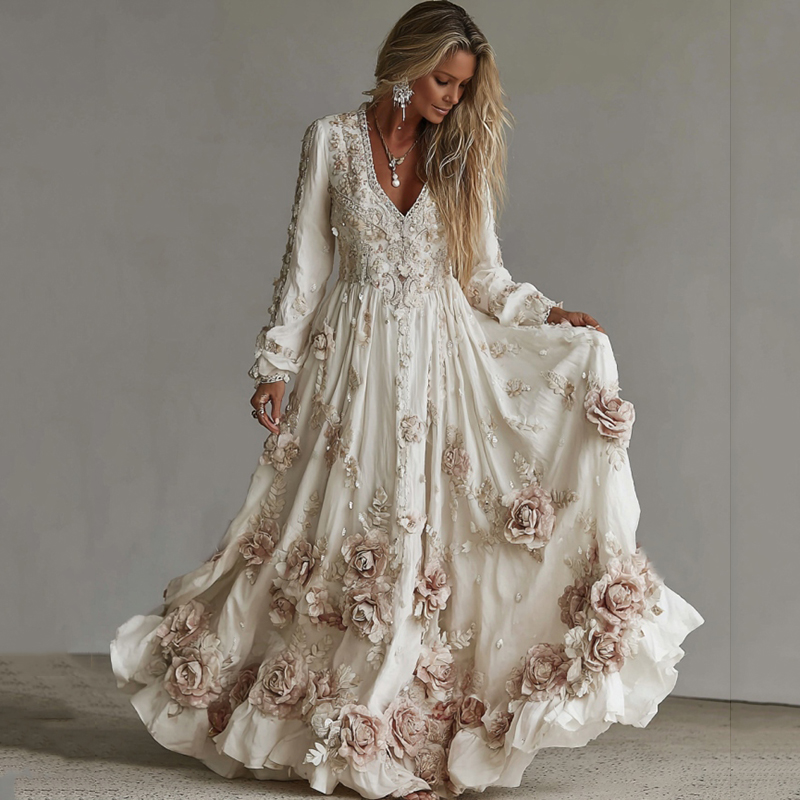 Women's Vintage Roses Art Print V-neck Long Sleeve Maxi Dress