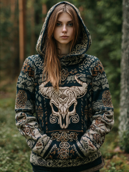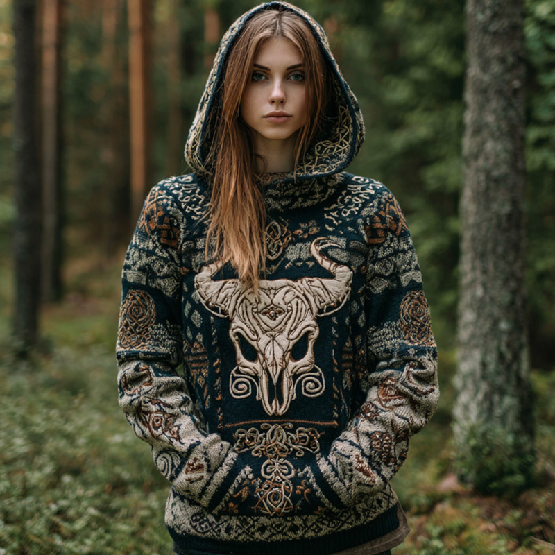 Women's Vintage Viking Tribal Celtic Skull Gradient Art Chunky Knit Hooded Sweater