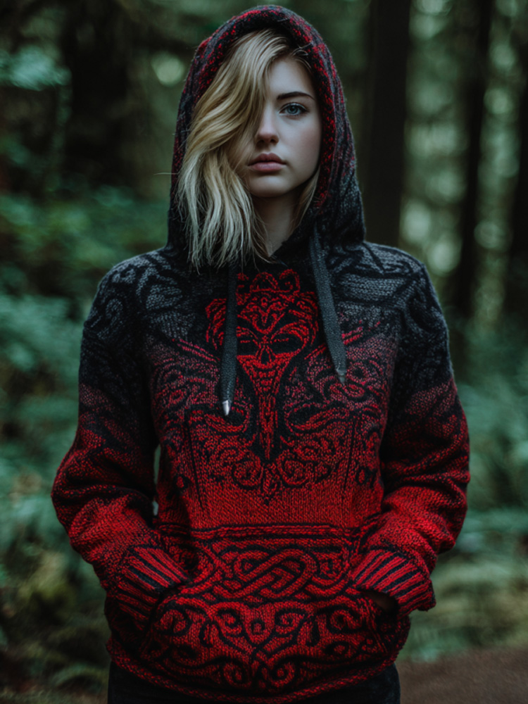 Women's Vintage Viking Tribal Celtic Skull Gradient Art Chunky Knit Hooded Sweater